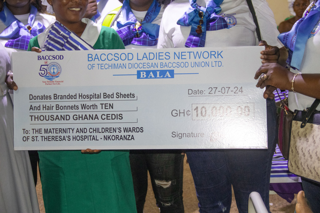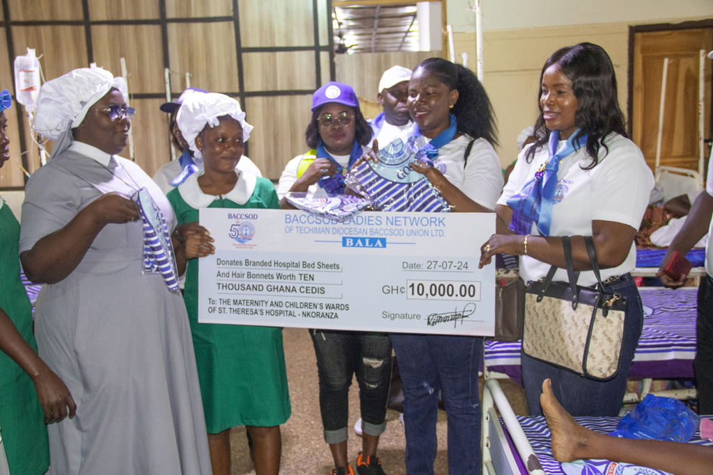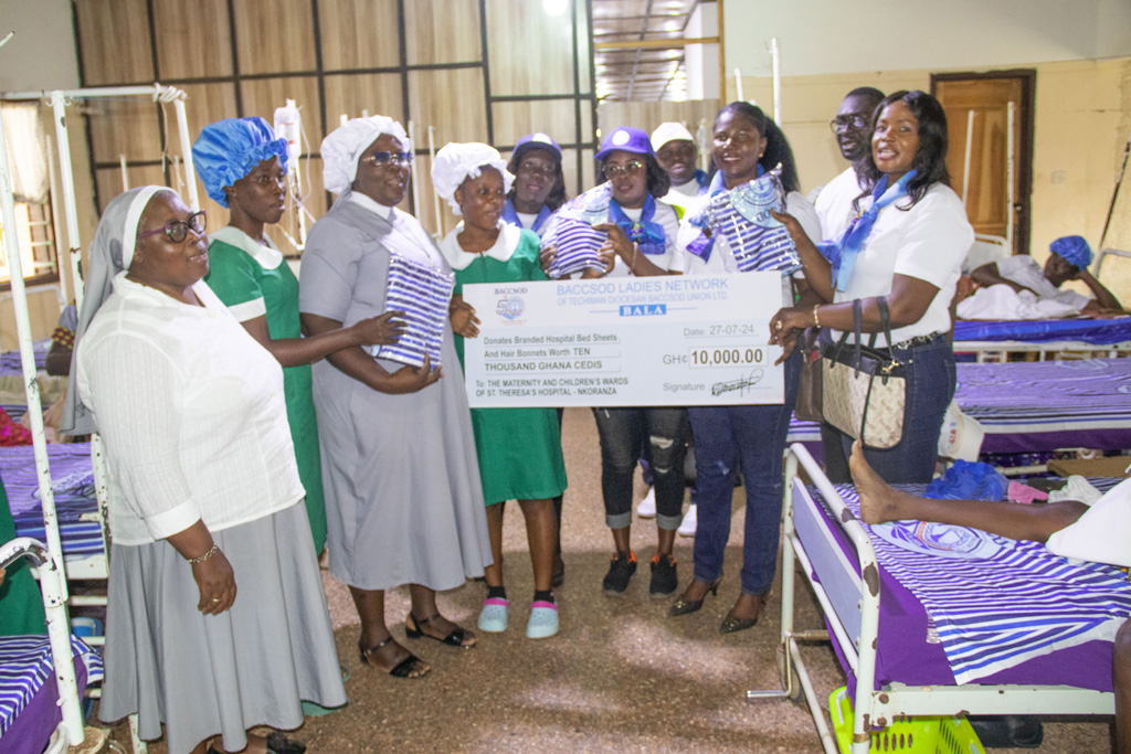 On Saturday, July 27th, 2024, the BACCSOD Ladies Network marked its 50th anniversary celebration by donating branded hospital bedsheets and hair bonnets worth GHS 10,000 to the Maternity and Children’s ward of St. Theresa’s Hospital in Nkoranza, Bono East Region. This charitable gesture is part of the organization’s efforts to give back to the community and support the well-being of mothers and children in the region.