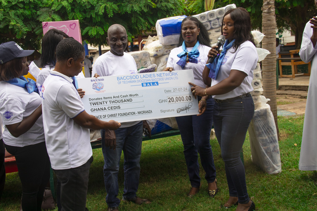 On Saturday, July 27th, 2024, the BACCSOD Ladies Network, in collaboration with Planet Rescue Foundation, an NGO based in Techiman, Bono East Region, donated items and cash worth GHS 20,000 to the Peace of Christ Foundation (PCC), a care home for mentally handicapped children in Nkoranza. The donation, which included foodstuffs, toiletries, detergents, and other essential items, was part of the BACCSOD Ladies Network’s 50th anniversary celebration activities. This generous gesture aims to support the well-being and care of the children at the PCC home.